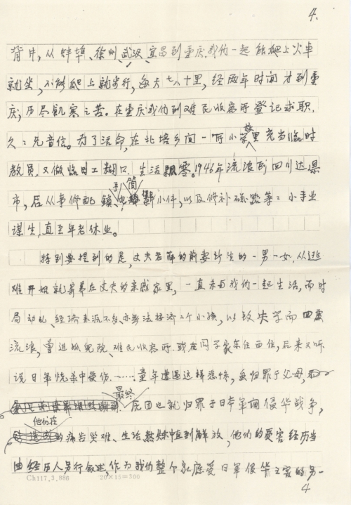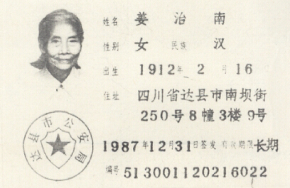 ④ In early spring of 1937, I risked my life to return by waterway to my work organization in Suzhou. At that time, Shanghai was about to fall. The Beijing-Shanghai railway was filled with the sound of guns and bombs day and night. Due to a chaotic social order, terror and unpredictable war condition, my work organization decided to dismiss all employees by paying each of us a 2-month salary. So, I departed from Guangfu District, Suzhou with my colleagues Mr. Wu (from Yangzhou) and Mr. Zhang (from Liuhe) and detoured to northern Jiangsu from Lake Tai by boat. Back then, Nanjing was about to fall too. Then, someone introduced Xue XX, also a dismissed agricultural technician, to me and I married him. After marriage, we began a fugitive life. We left home for Bengbu, Xuzhou, Wuhan, Yichang and Chongqing. We would take a train if we could, or walk 70 or 80 li (1 li = 500 meters) every day on foot. It took us two years to reach Chongqing after suffering from hunger and cold. Then, we registered at the Refugee Camp to look for a job, but didn’t receive any reply for a long time. So, to make a living, we found a job as a temporary teacher at a school in the countryside of Beibei and also did a part-time job as a casual laborer. In 1946, we came to Da County, Sichuan Province, where we made a living by repairing locks, flashlights and equipment, etc. until retirement due to old age.