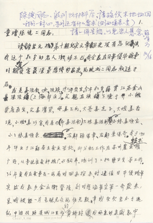 I am Jiang Zhinan, female, Han, 82, born in 1911 in Zhujing Town, Jinshan County, Jiangsu (now suburb of Shanghai). My father ran a small grocery store in Xiatang Street, Zhujing Town. My father was Jiang Weixian, my mother Mrs. Jiang, older brother Jiang Jiezi, oldest sister Jiang Xingguan, second oldest sister Jiang Qiaoguan, I (the fourth child) Jiang Zhinan, my third youngest sister Jiang Zhixin, second youngest sister Jiang Shunbao and the youngest sister Jiang Shunrong, our left neighbor Gu Beizhang and right neighbor Zhu Baoqi. In 1931, I was assigned to work at Suzhou Agricultural Technology Promotion Institute after graduating from Jiangsu Provincial Sericulture School. My job was improving, promoting and feeding silkworm eggs and I also provided training to two groups of trainees. In the summer of 1936, I paid a visit home after my work was completed. Unexpectedly, the invading Japanese army landed at Jinshanwei in my hometown. Our county fell into ruin after being attacked by the Japanese air force, army and navy at the same time and countless people died or were injured. Luckily, my whole family had fled to Huangqiao Village over 10 li (1 li=500 meters) from the county and lived in one of my mother’s relatives’ house. We thought we had escaped the disaster, but my family was afterwards torn apart. The details are provided below: