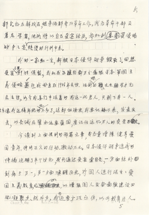 My family and my life are ruined by Japan’s war of aggression against China. It breaks my heart every time I recall memories of the suffering. My offspring and I hate the atrocities of Japanese imperialist invaders to the core. My mother passed away in 1956, followed by my third youngest sister Zhixin and her husband Gu Xuecai. Now, I am the only old person alive in my family. There are not many people of my age in my hometown. I must record the tragic history and publish it to educate the future generation to always love the country and remember the history when millions of people suffered.