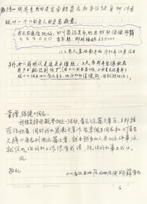 P.S. My daughter Xue Mingyi is a worker at the filature of Da County, so I registered my household with the factory after my retirement due to old age. (At that time, my son worked in Xichang and my youngest daughter worked at a border area)