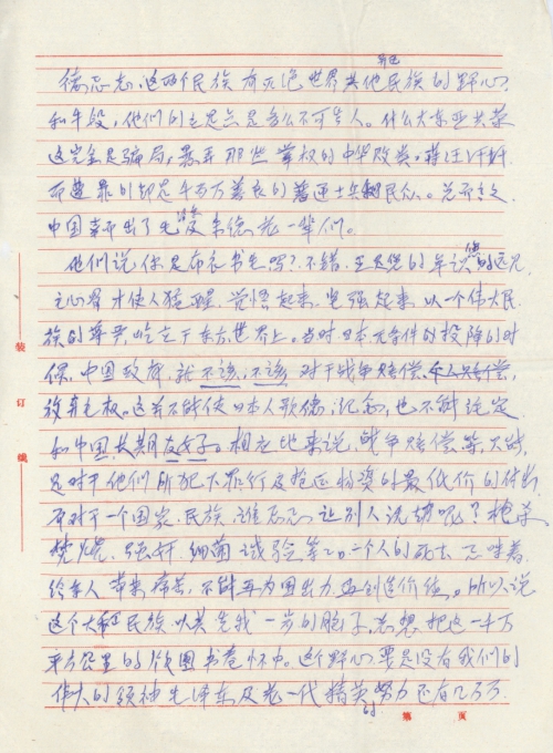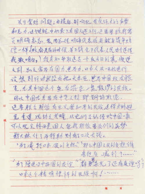 关于索赔问题,由提出到响应,造成强大的声势和压力,这个过程中如果只有国人还不行,还需要政府要员明确表态,[像]周总理明确代表政府放弃战争赔偿一样。(政府有的时候,并不能全部代表人民这个道理我最明白。)放弃和争取这是一个反方向的事,顺逆之别,总之需要有国力,世界力,日本人从一开始进行设想,尤其中国这个鱼龙混杂,一般散沙的民族。所以中国尤其要有中坚人物,即钢筋水泥,还要联合那些有正义,爱和平的民族,这样才能避免重遭洗劫之苦难,从[他]们否认侵略中国一事可以完全惊醒国人包括那些要员们的美梦,斯大林信了希特勒则有了二次大战。