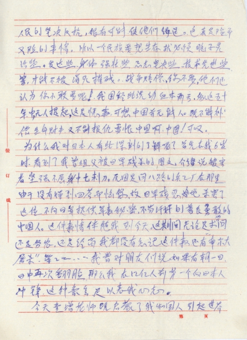 为什么我对日本人有此深刻的了解呢?首先在我6岁时,看到了我曾祖父被日军残杀的图文,介绍说被害者坚强不屈身重七刺刀。原因是问八路军的兵工厂在[哪]里,由于没有得到回答而恼怒,故日军残忍地杀害了这位不向日军提供军事秘密,不当汉奸的善良勇敢的中国人。这件事情伴随我到今天。这期间无论是求学问还是务农,还是经商我都没有忘记这件事,还有“南京大屠杀”,等等……,我曾对朋友们说如果有朝一日,日中再次翻脸,那么我在12亿人前第一个向日本人冲锋,这种豪言足以表我心意。