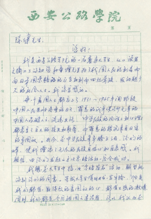 我是西安公路学院的一名普通大学生,从《读者文摘》上得知您和童增先生为了我国人民的利益而向日本国索赔的正当权利而四处奔波,发动起广大的社会人士。我深受感动。