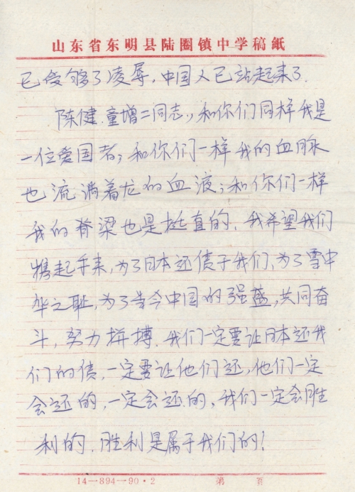 陈健、童增二同志,和你们同样我是一位爱国者,和你们一样我的血脉也流淌着龙的血液;和你们一样我的脊梁也是挺直的,我希望我们携起手来,为了日本还债于我们,为了雪中华之耻,为了当今中国的强生,共同奋斗,努力拼搏。我们一定要让日本还我们的债,一定要让他们还,他们一定会还的,一定会还的,我们一定会胜利的,胜利是属于我们的!